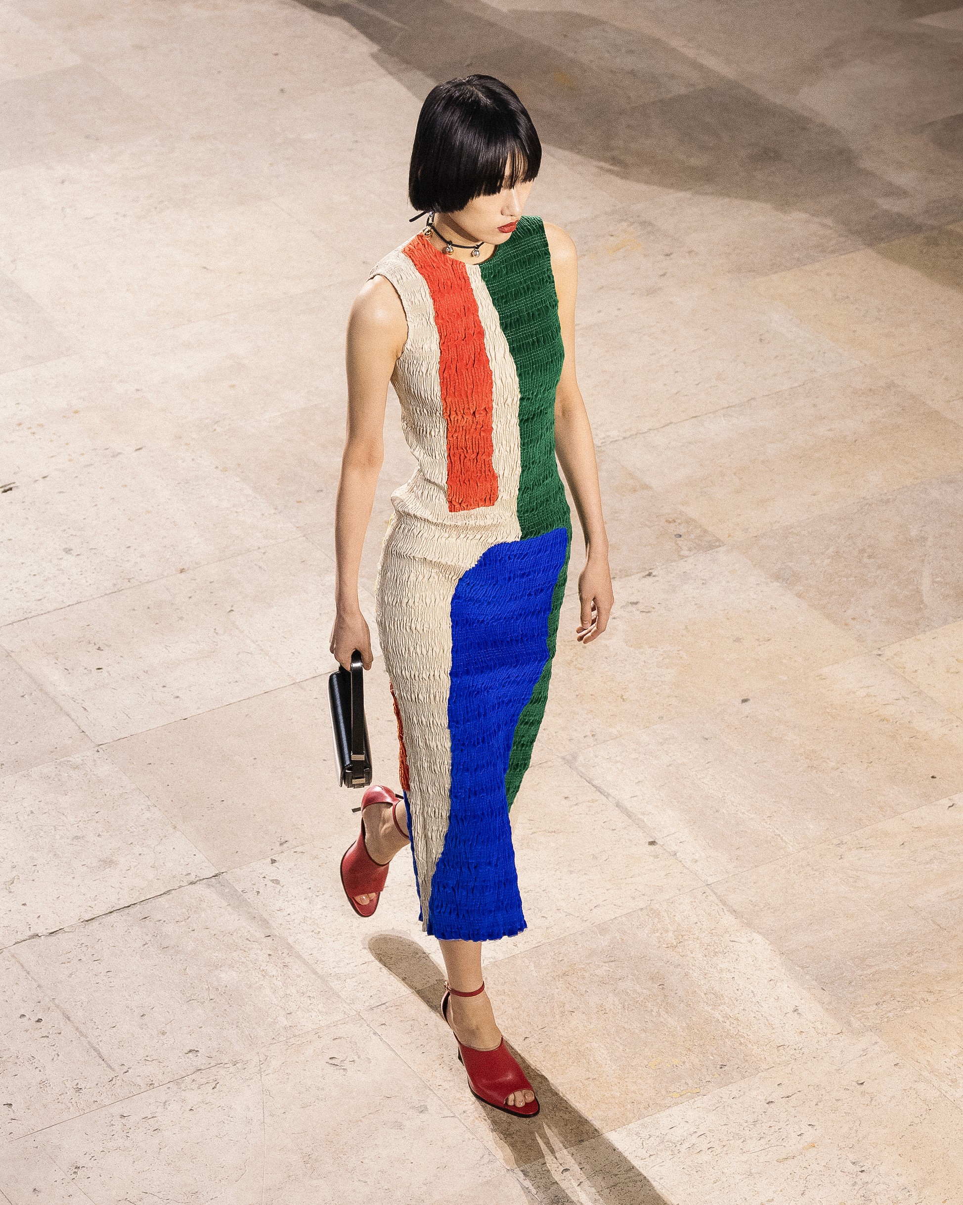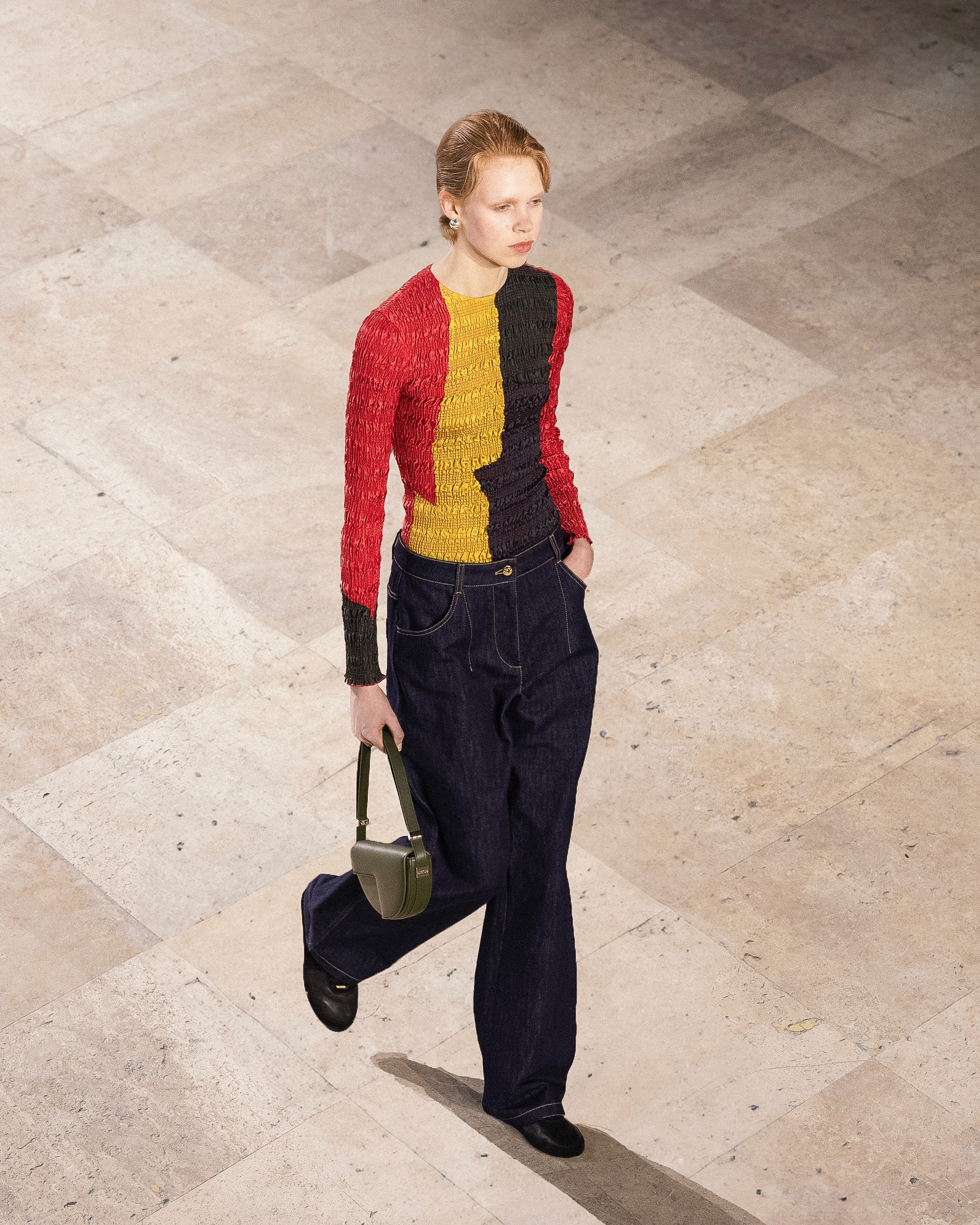 Cette saison, le langage chromatique est au coeur de l’image. Elle explore le travail des couleurs primaires, complémentaires, analogues. Les teintes clashent, font echo, se répondent et crées des associations inattendues mais toujours équilibrées. À l’image de cette collection, elles évoquent une logique proche du vitrail, où la lumière est travaillée sous toutes ses formes, et où chaque couleur existe à la fois individuellement et en relation avec les autres. La couleur devient alors un langage, un son, et agit comme l’effet d’un rythme. Chaque composition développe sa propre mélodie.